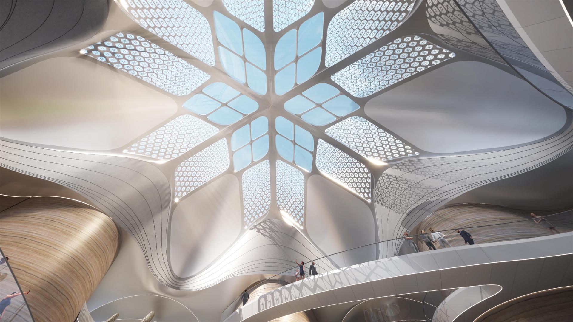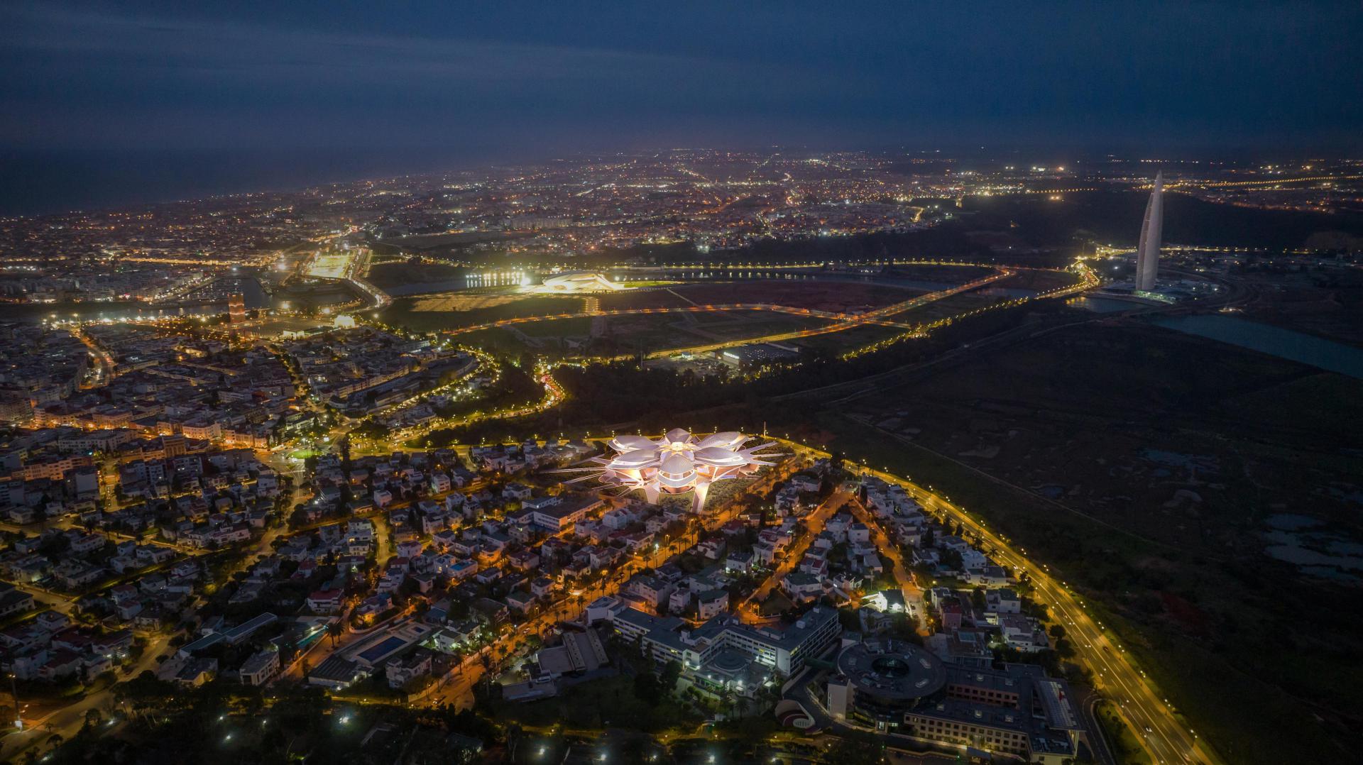 Seen from above, the museum evokes the shape of a fleur-de-lis unfurling its petals like a crown. It is a biomimetic representation, where the curves stretch elegantly to form winding paths that blend harmoniously into the landscape. This aesthetic recalls the desert atmosphere where archaeological treasures are buried, but also the complex art of Moroccan geometry, adding an evocative dimension to the visitor experience.