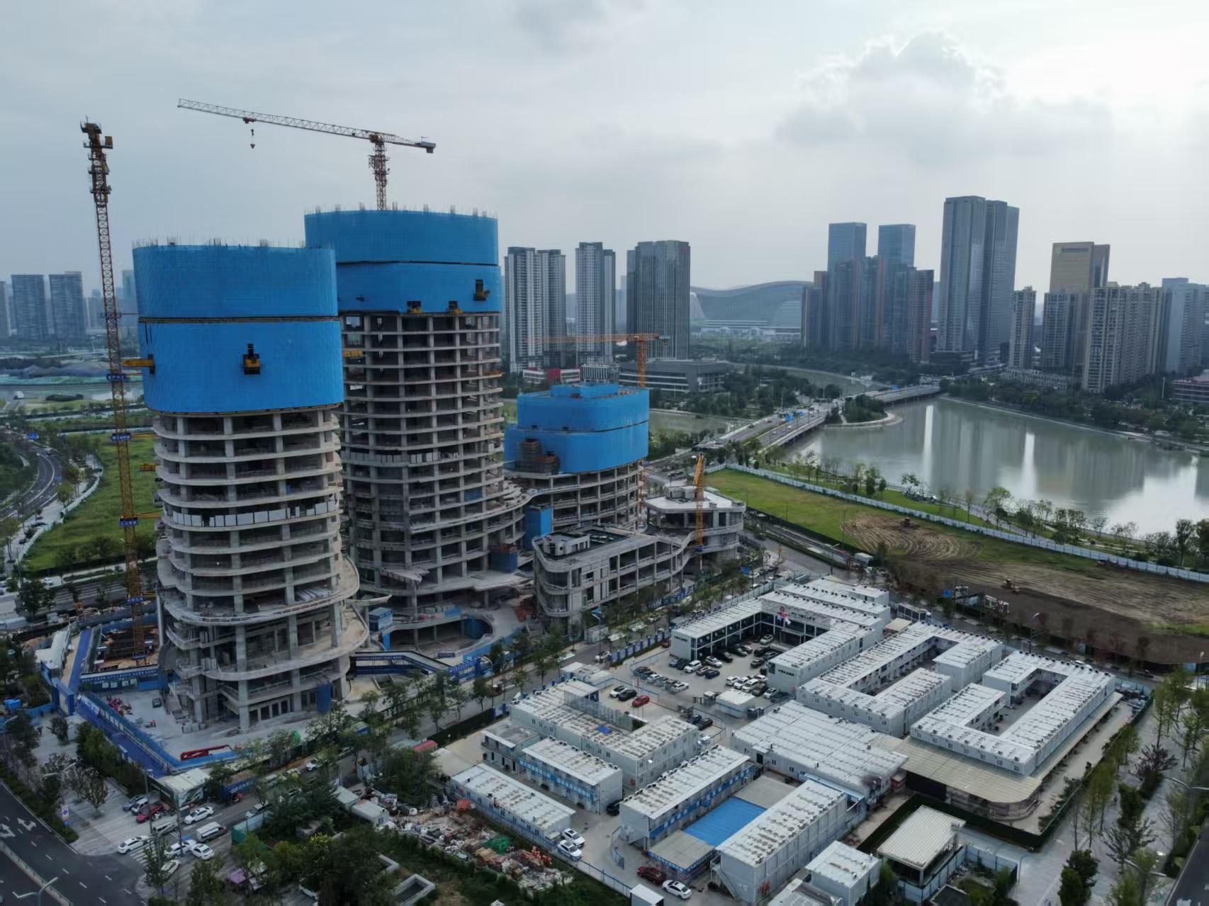 A competition won in 2021, the NBD Centre is nearing topping up. Located at Guixi Ecological Park within the Jiaozi Park Business District in Chengdu, the 120m high twin towers overlooks the Jinjiang River and the Chengdu Skyline beyond.
